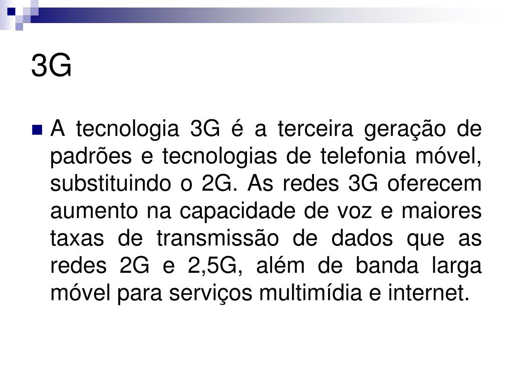 3G • A tecnologia 3G é a terceira geração de padrões e tecnologias de telefonia móvel, substituindo o 2G. As redes 3G oferecem aumento na capacidade de voz e maiores taxas de transmissão de dados que as redes 2G e 2,5G, além de banda larga móvel para serviços multimídia e internet.