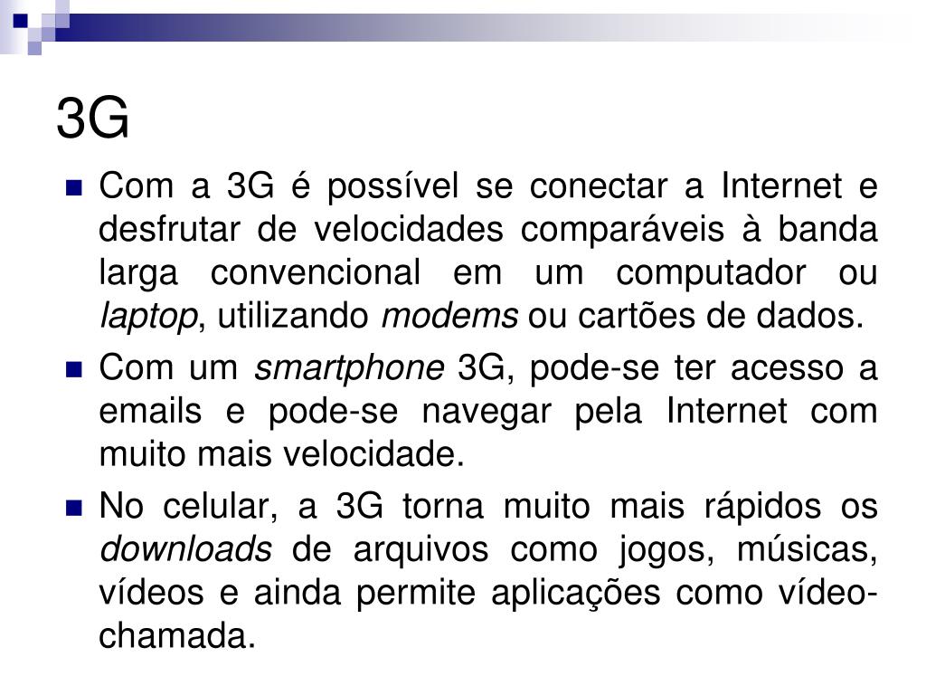 3G • Com a 3G é possível se conectar a Internet e desfrutar de velocidades comparáveis à banda larga convencional em um computador ou laptop, utilizando modems ou cartões de dados. • Com um smartphone 3G, pode-se ter acesso a emails e pode-se navegar pela Internet com muito mais velocidade. • No celular, a 3G torna muito mais rápidos os downloads de arquivos como jogos, músicas, vídeos e ainda permite aplicações como vídeo-chamada.