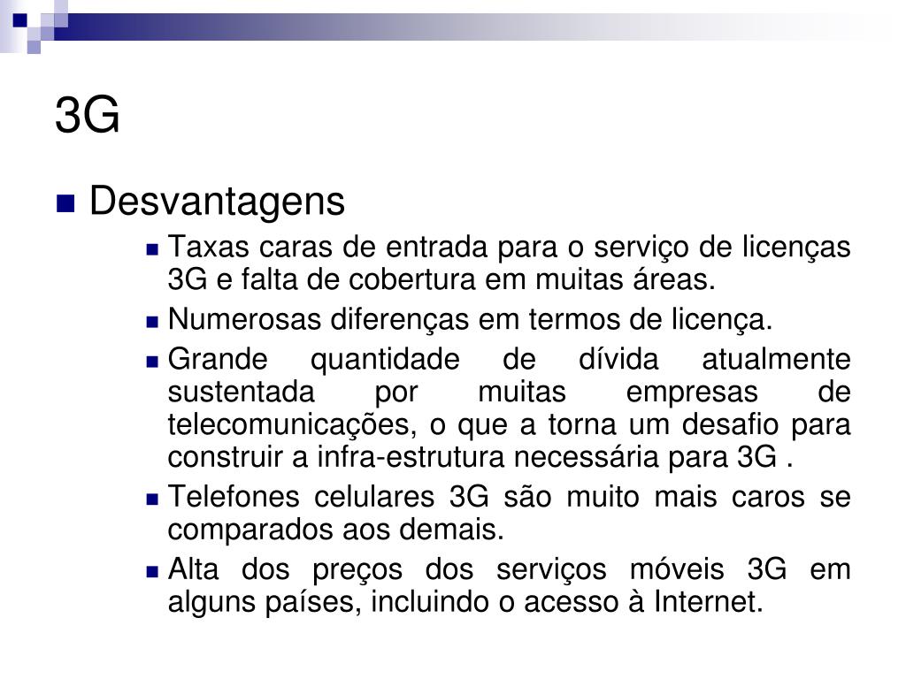 3G • Desvantagens • Taxas caras de entrada para o serviço de licenças 3G e falta de cobertura em muitas áreas. • Numerosas diferenças em termos de licença. • Grande quantidade de dívida atualmente sustentada por muitas empresas de telecomunicações, o que a torna um desafio para construir a infra-estrutura necessária para 3G . • Telefones celulares 3G são muito mais caros se comparados aos demais. • Alta dos preços dos serviços móveis 3G em alguns países, incluindo o acesso à Internet.
