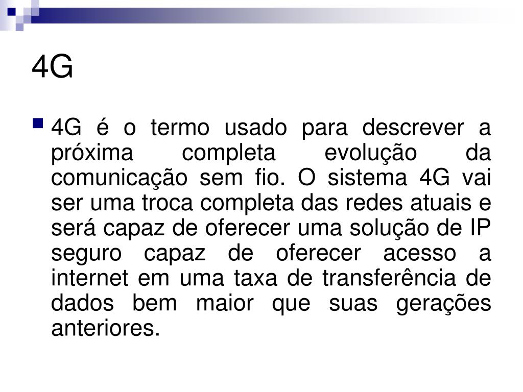 4G • 4G é o termo usado para descrever a próxima completa evolução da comunicação sem fio. O sistema 4G vai ser uma troca completa das redes atuais e será capaz de oferecer uma solução de IP seguro capaz de oferecer acesso a internet em uma taxa de transferência de dados bem maior que suas gerações anteriores.