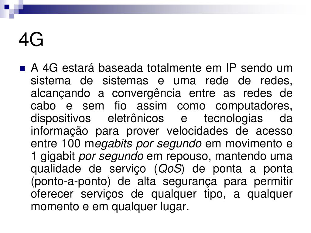 4G • A 4G estará baseada totalmente em IP sendo um sistema de sistemas e uma rede de redes, alcançando a convergência entre as redes de cabo e sem fio assim como computadores, dispositivos eletrônicos e tecnologias da informação para prover velocidades de acesso entre 100 megabits por segundo em movimento e 1 gigabit por segundo em repouso, mantendo uma qualidade de serviço (QoS) de ponta a ponta (ponto-a-ponto) de alta segurança para permitir oferecer serviços de qualquer tipo, a qualquer momento e em qualquer lugar.