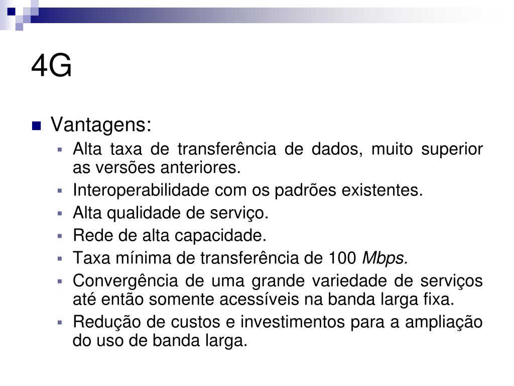 4G • Vantagens: • Alta taxa de transferência de dados, muito superior as versões anteriores. • Interoperabilidade com os padrões existentes. • Alta qualidade de serviço. • Rede de alta capacidade. • Taxa mínima de transferência de 100 Mbps. • Convergência de uma grande variedade de serviços até então somente acessíveis na banda larga fixa. • Redução de custos e investimentos para a ampliação do uso de banda larga.