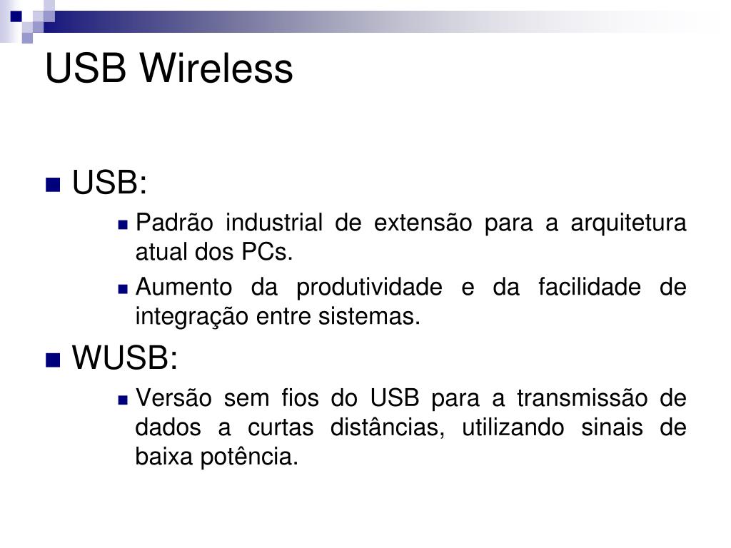 USB Wireless • USB: • Padrão industrial de extensão para a arquitetura atual dos PCs. • Aumento da produtividade e da facilidade de integração entre sistemas. • WUSB: • Versão sem fios do USB para a transmissão de dados a curtas distâncias, utilizando sinais de baixa potência.
