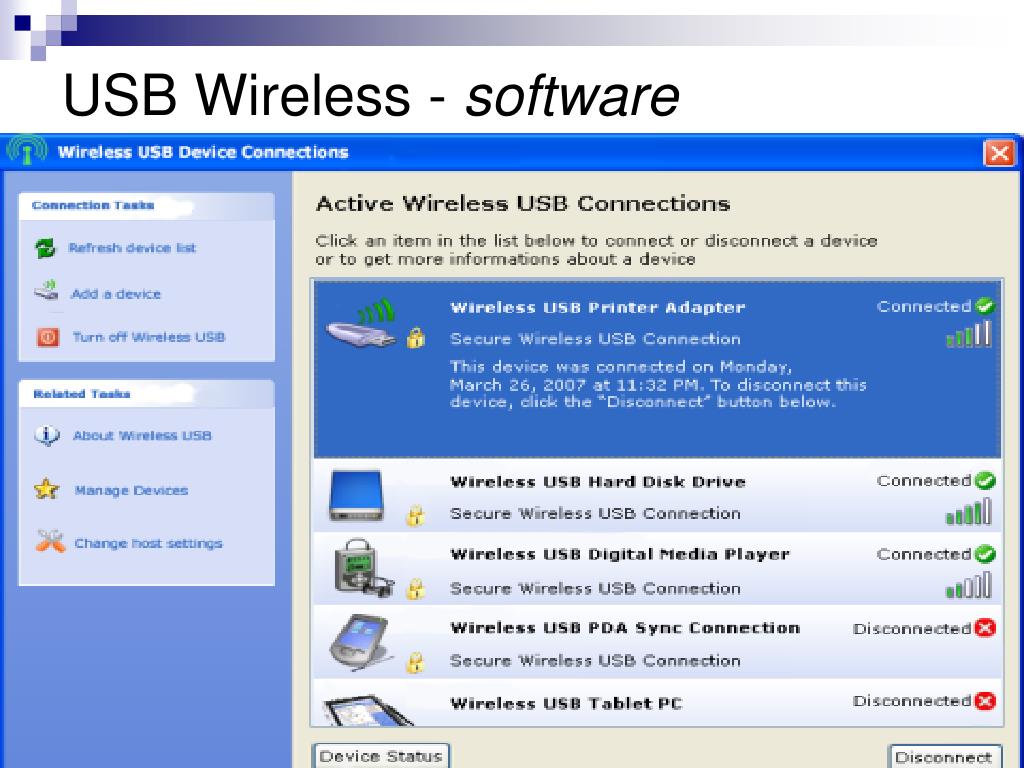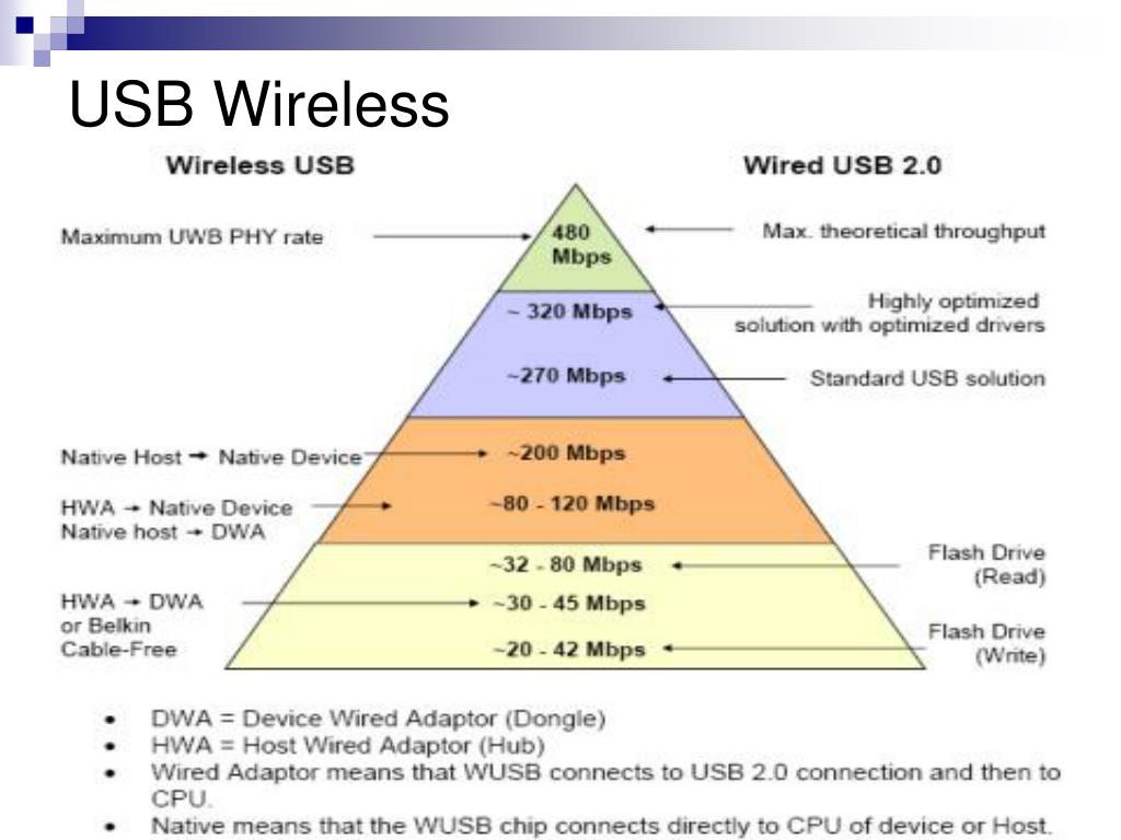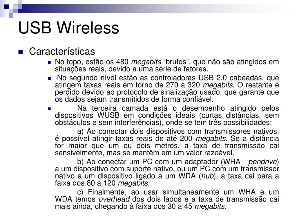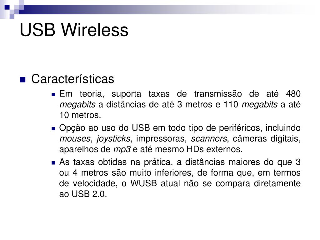 USB Wireless • Características • Em teoria, suporta taxas de transmissão de até 480 megabits a distâncias de até 3 metros e 110 megabits a até 10 metros. • Opção ao uso do USB em todo tipo de periféricos, incluindo mouses, joysticks, impressoras, scanners, câmeras digitais, aparelhos de mp3 e até mesmo HDs externos. • As taxas obtidas na prática, a distâncias maiores do que 3 ou 4 metros são muito inferiores, de forma que, em termos de velocidade, o WUSB atual não se compara diretamente ao USB 2.0.