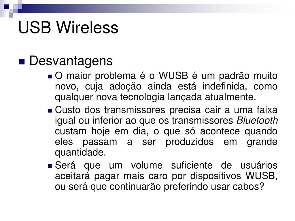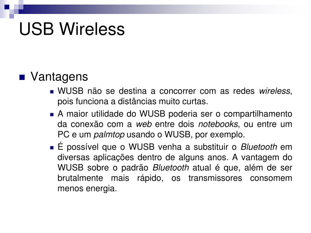 USB Wireless • Vantagens • WUSB não se destina a concorrer com as redes wireless, pois funciona a distâncias muito curtas. • A maior utilidade do WUSB poderia ser o compartilhamento da conexão com a web entre dois notebooks, ou entre um PC e um palmtop usando o WUSB, por exemplo. • É possível que o WUSB venha a substituir o Bluetooth em diversas aplicações dentro de alguns anos. A vantagem do WUSB sobre o padrão Bluetooth atual é que, além de ser brutalmente mais rápido, os transmissores consomem menos energia.