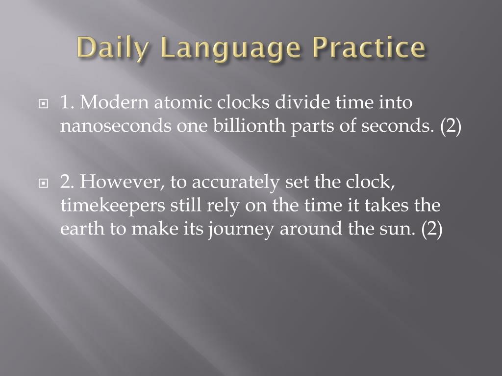 Daily Language Practice • 1. Modern atomic clocks divide time into nanoseconds one billionth parts of seconds. (2) • 2. However, to accurately set the clock, timekeepers still rely on the time it takes the earth to make its journey around the sun. (2)