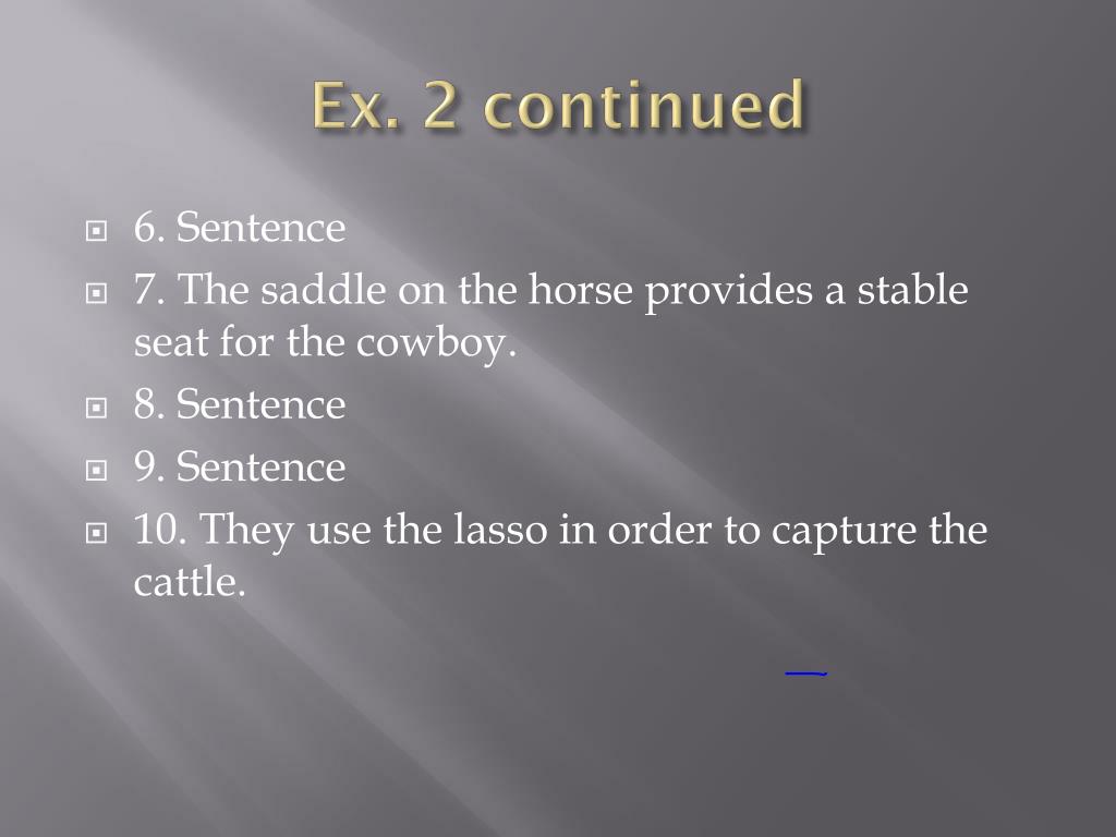 Ex. 2 continued • 6. Sentence • 7. The saddle on the horse provides a stable seat for the cowboy. • 8. Sentence • 9. Sentence • 10. They use the lasso in order to capture the cattle.