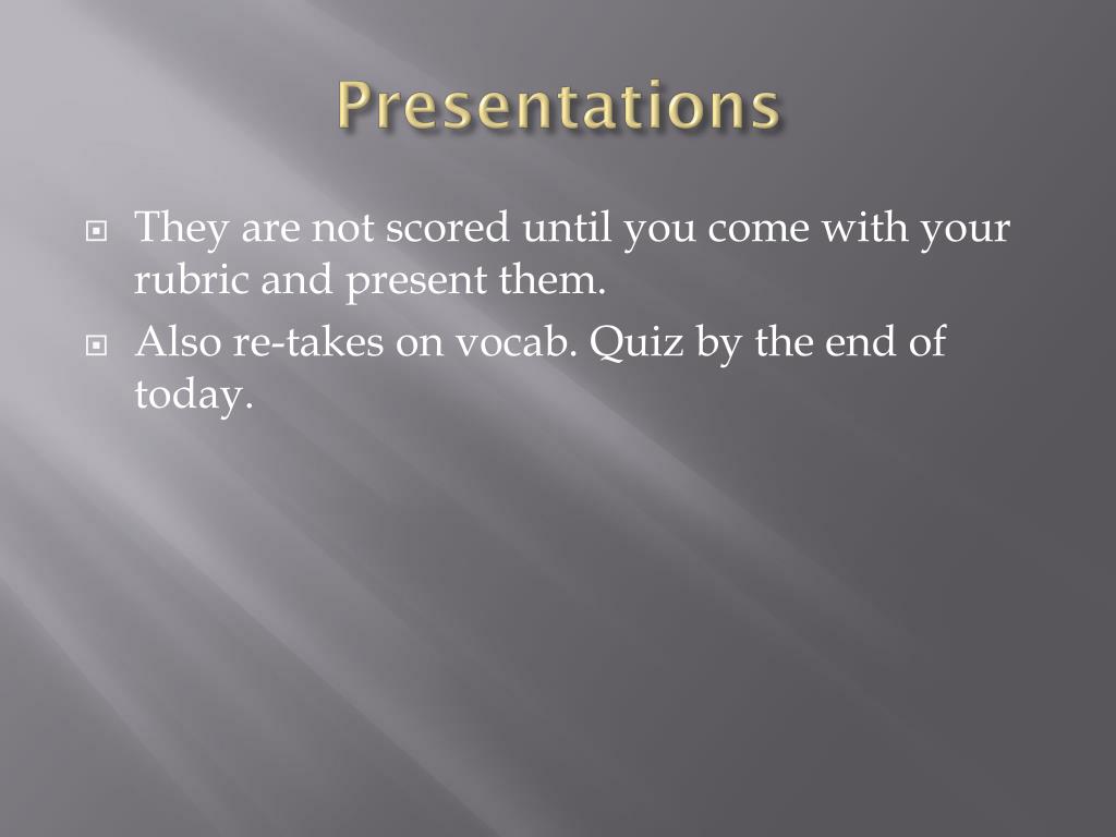 Presentations • They are not scored until you come with your rubric and present them. • Also re-takes on vocab. Quiz by the end of today.