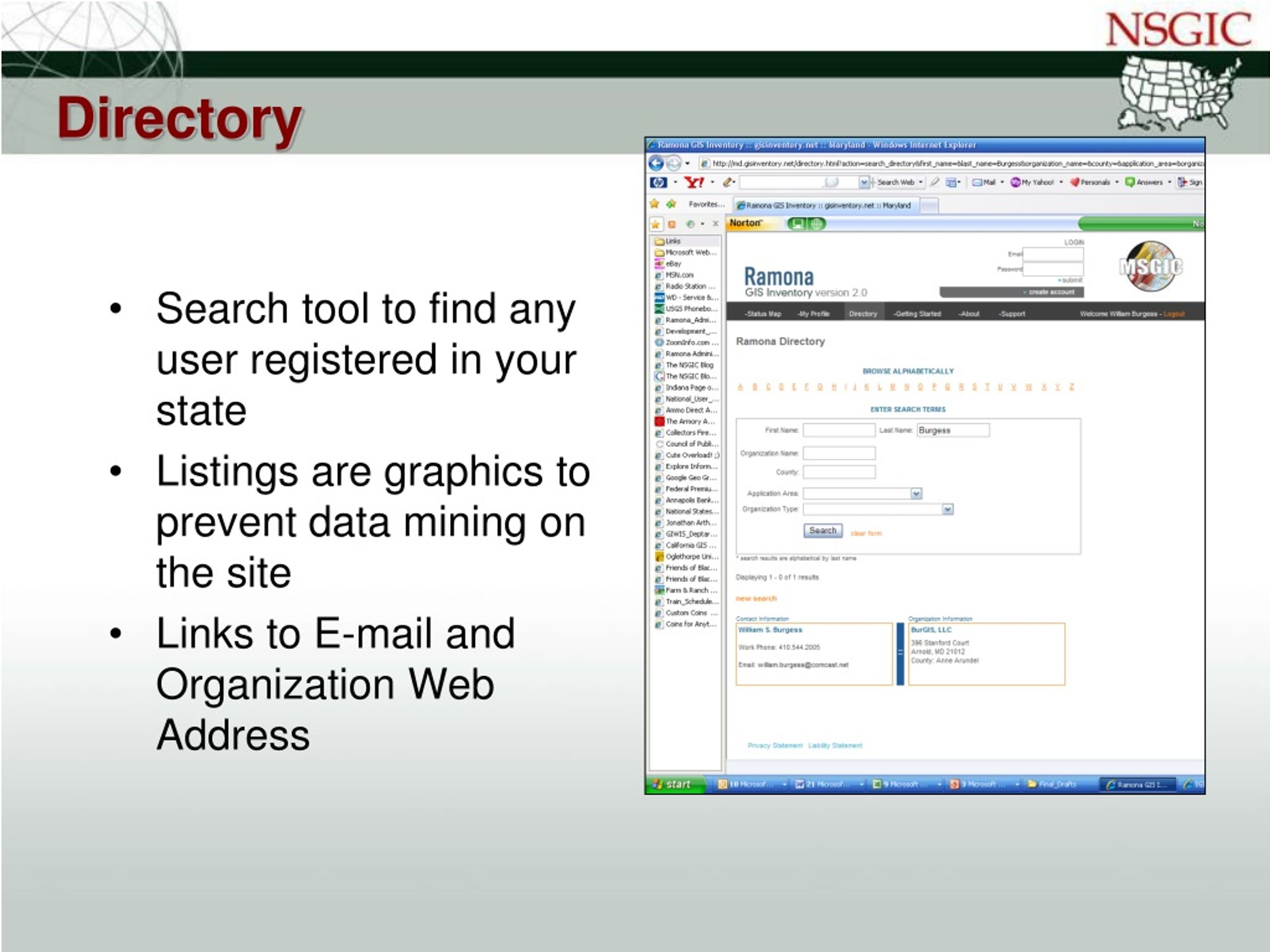 Search tool to find any user registered in your state Listings are graphics to prevent data mining on the site Links to E-mail and Organization Web Address Directory