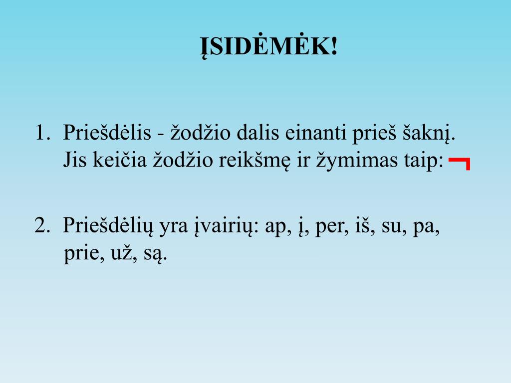 ĮSIDĖMĖK! • Priešdėlis - žodžio dalis einanti prieš šaknį. Jis keičia žodžio reikšmę ir žymimas taip: 2. Priešdėlių yra įvairių: ap, į, per, iš, su, pa, prie, už, są. ¬