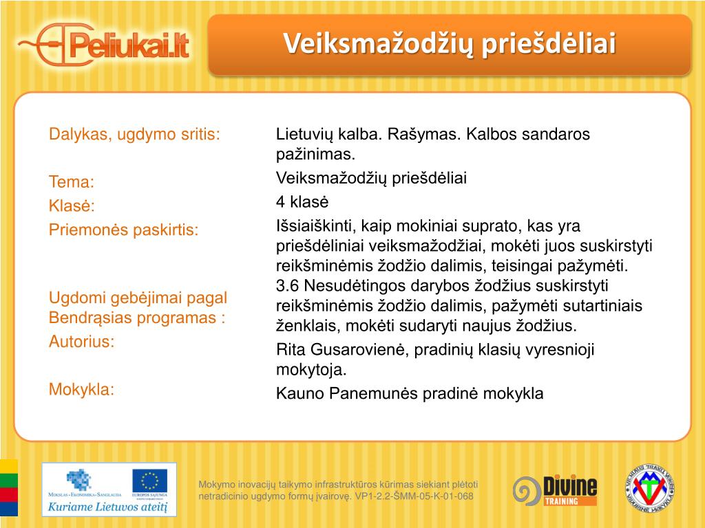 Veiksmažodžių priešdėliai Dalykas, ugdymo sritis: Tema: Klasė: Priemonės paskirtis: Ugdomi gebėjimai pagal Bendrąsias programas : Autorius: Mokykla: Lietuvių kalba. Rašymas. Kalbos sandaros pažinimas. Veiksmažodžių priešdėliai 4klasė Išsiaiškinti, kaip mokiniai suprato, kas yra priešdėliniai veiksmažodžiai, mokėti juos suskirstyti reikšminėmis žodžio dalimis, teisingai pažymėti. • 3.6 Nesudėtingos darybos žodžius suskirstyti reikšminėmis žodžio dalimis, pažymėti sutartiniais ženklais, mokėti sudaryti naujus žodžius. Rita Gusarovienė, pradinių klasių vyresnioji mokytoja. Kauno Panemunės pradinė mokykla