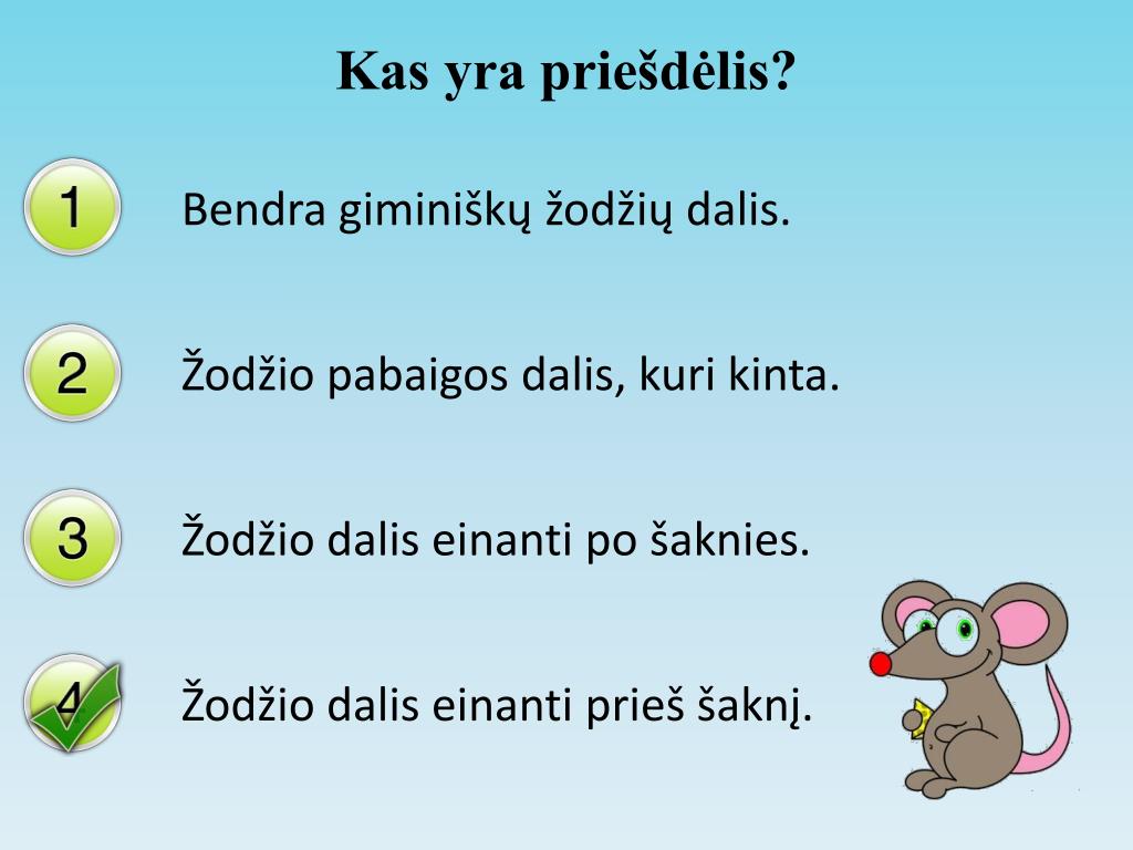 Kas yra priešdėlis? Bendra giminiškų žodžių dalis. Žodžio pabaigos dalis, kuri kinta. Žodžio dalis einanti po šaknies. Žodžio dalis einanti prieš šaknį.