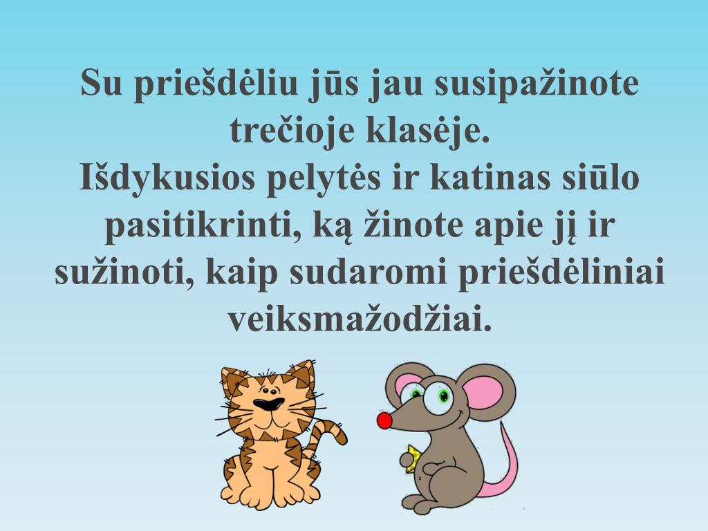 Su priešdėliu jūs jau susipažinote trečioje klasėje. Išdykusios pelytės ir katinas siūlo pasitikrinti, ką žinote apie jį ir sužinoti, kaip sudaromi priešdėliniai veiksmažodžiai.