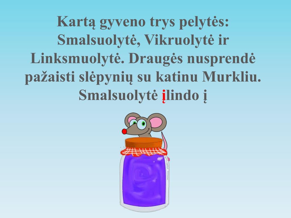 Murklys ilgai ieškojo pelyčių, bet nesurado. Tuomet Smaluolytė iššoko iš stiklainio, Vikruolytė išlindo iš po šluotos, o Linksmuolytė ištipeno iš už spintos.