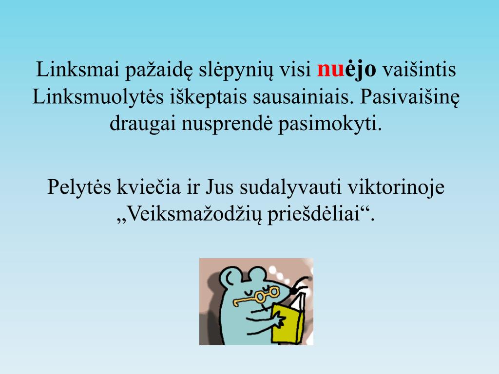 Linksmai pažaidę slėpynių visi nuėjo vaišintis Linksmuolytės iškeptais sausainiais. Pasivaišinę draugai nusprendė pasimokyti. Pelytės kviečia ir Jus sudalyvauti viktorinoje „Veiksmažodžių priešdėliai“.