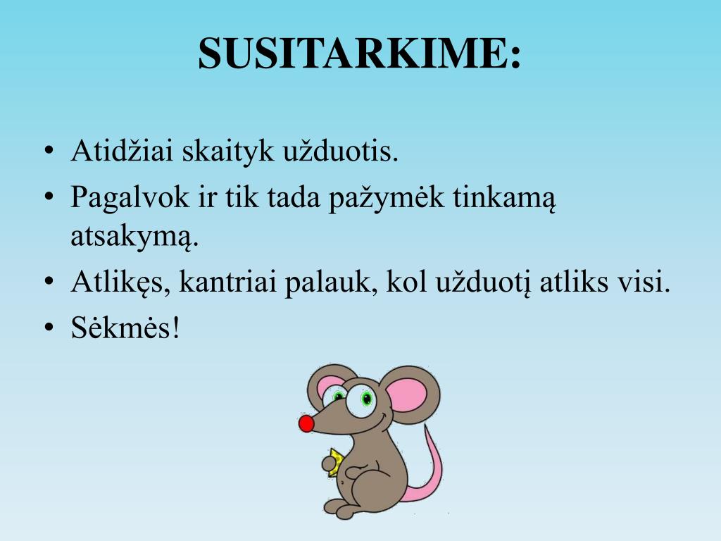 SUSITARKIME: Atidžiai skaityk užduotis. Pagalvok ir tik tada pažymėk tinkamą atsakymą. Atlikęs, kantriai palauk, kol užduotį atliks visi. Sėkmės!