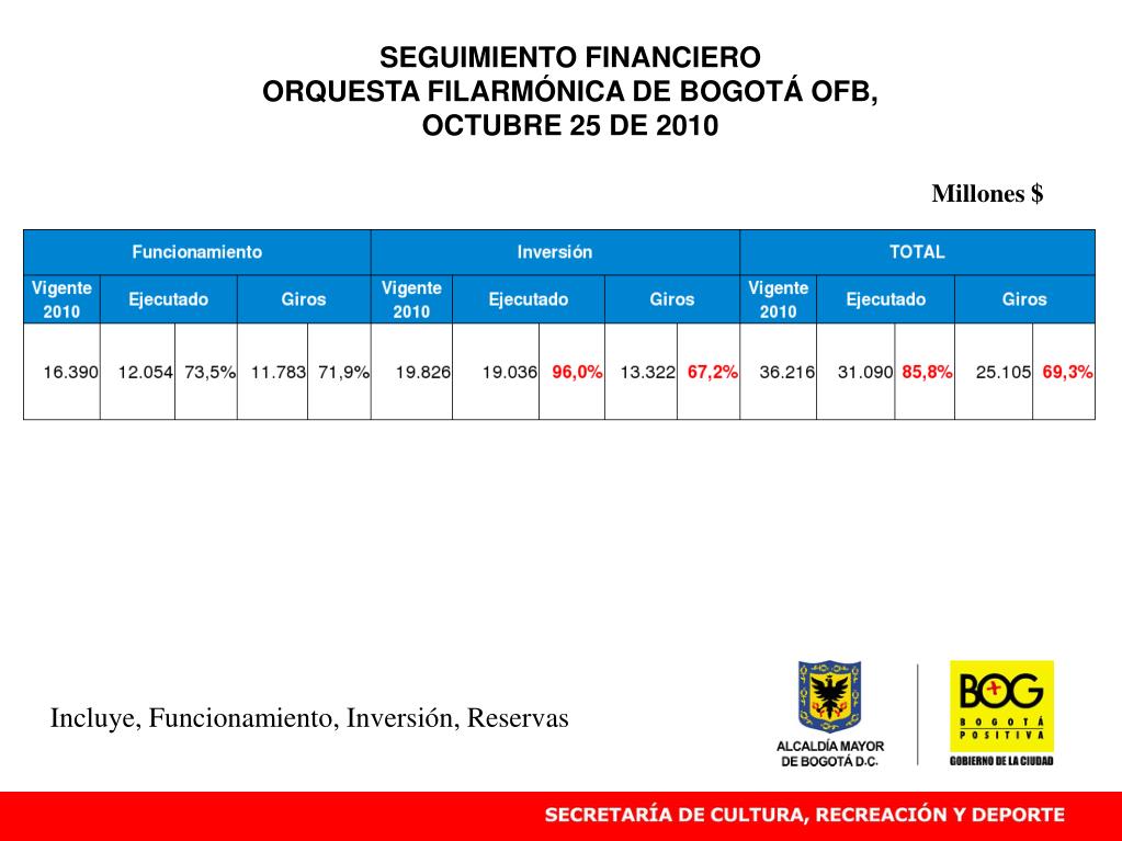 SEGUIMIENTO FINANCIERO ORQUESTA FILARMÓNICA DE BOGOTÁ OFB, OCTUBRE 25 DE 2010 Millones $ Incluye, Funcionamiento, Inversión, Reservas