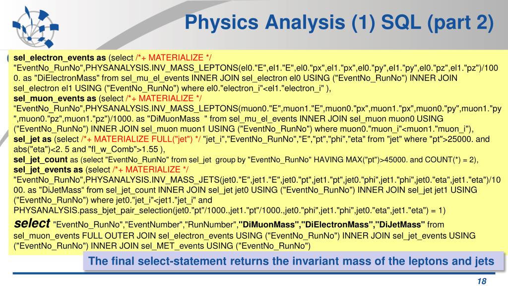 Physics Analysis (1) SQL (part 2) sel_electron_events as (select /*+ MATERIALIZE */ "EventNo_RunNo",PHYSANALYSIS.INV_MASS_LEPTONS(el0."E",el1."E",el0."px",el1."px",el0."py",el1."py",el0."pz",el1."pz")/1000. as "DiElectronMass" from sel_mu_el_events INNER JOIN sel_electron el0 USING ("EventNo_RunNo") INNER JOIN sel_electron el1 USING ("EventNo_RunNo") where el0."electron_i"<el1."electron_i" ), sel_muon_eventsas (select /*+ MATERIALIZE */ “EventNo_RunNo",PHYSANALYSIS.INV_MASS_LEPTONS(muon0."E",muon1."E",muon0."px",muon1."px",muon0."py",muon1."py",muon0."pz",muon1."pz")/1000. as "DiMuonMass " from sel_mu_el_events INNER JOIN sel_muon muon0 USING ("EventNo_RunNo") INNER JOIN sel_muon muon1 USING ("EventNo_RunNo") where muon0."muon_i"<muon1."muon_i"), sel_jetas (select /*+ MATERIALIZE FULL("jet") */ "jet_i","EventNo_RunNo","E","pt","phi","eta" from "jet" where "pt">25000. and abs("eta")<2. 5 and "fl_w_Comb">1.55 ), sel_jet_countas (select "EventNo_RunNo" from sel_jetgroup by "EventNo_RunNo" HAVING MAX("pt")>45000. and COUNT(*) = 2), sel_jet_eventsas (select /*+ MATERIALIZE */ "EventNo_RunNo",PHYSANALYSIS.INV_MASS_JETS(jet0."E",jet1."E",jet0."pt",jet1."pt",jet0."phi",jet1."phi",jet0."eta",jet1."eta")/1000. as "DiJetMass“ from sel_jet_countINNER JOIN sel_jet jet0 USING ("EventNo_RunNo") INNER JOIN sel_jetjet1 USING ("EventNo_RunNo") where jet0."jet_i"<jet1."jet_i" and PHYSANALYSIS.pass_bjet_pair_selection(jet0."pt"/1000.,jet1."pt"/1000.,jet0."phi",jet1."phi",jet0."eta",jet1."eta") = 1) select "EventNo_RunNo","EventNumber","RunNumber","DiMuonMass","DiElectronMass","DiJetMass" from sel_muon_events FULL OUTER JOIN sel_electron_events USING ("EventNo_RunNo") INNER JOIN sel_jet_eventsUSING ("EventNo_RunNo") INNER JOIN sel_MET_events USING ("EventNo_RunNo") The final select-statement returns the invariant mass of the leptons and jets