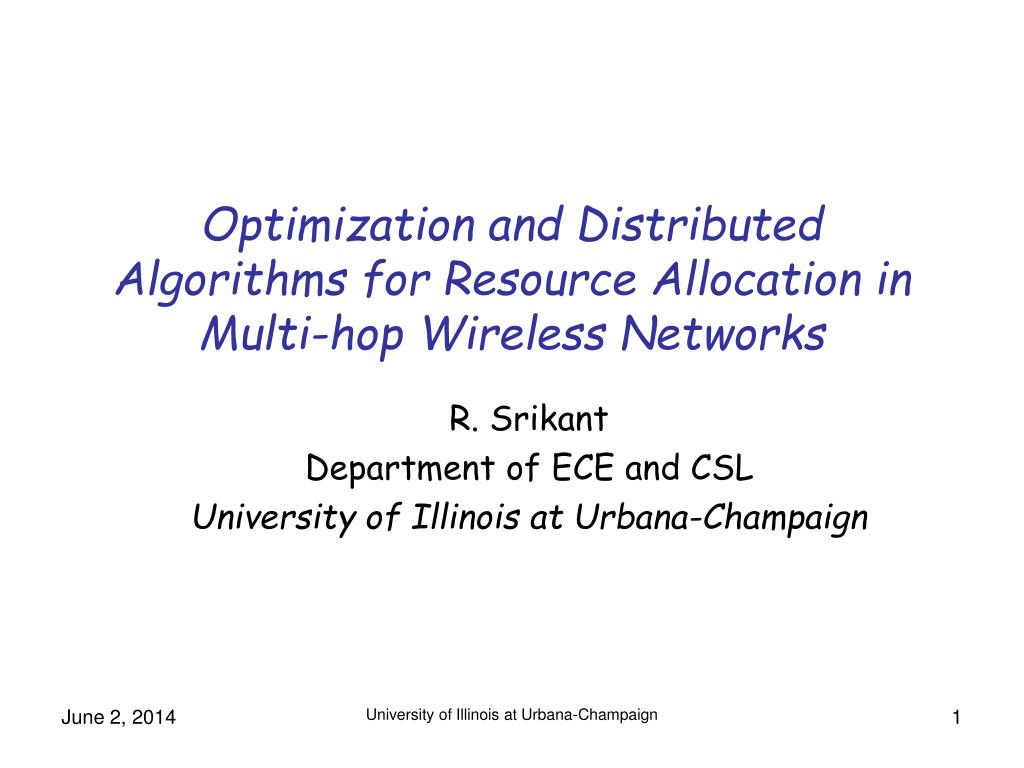 Optimization and Distributed Algorithms for Resource Allocation in Multi-hop Wireless Networks R. Srikant Department of ECE and CSL University of Illinois at Urbana-Champaign University of Illinois at Urbana-Champaign