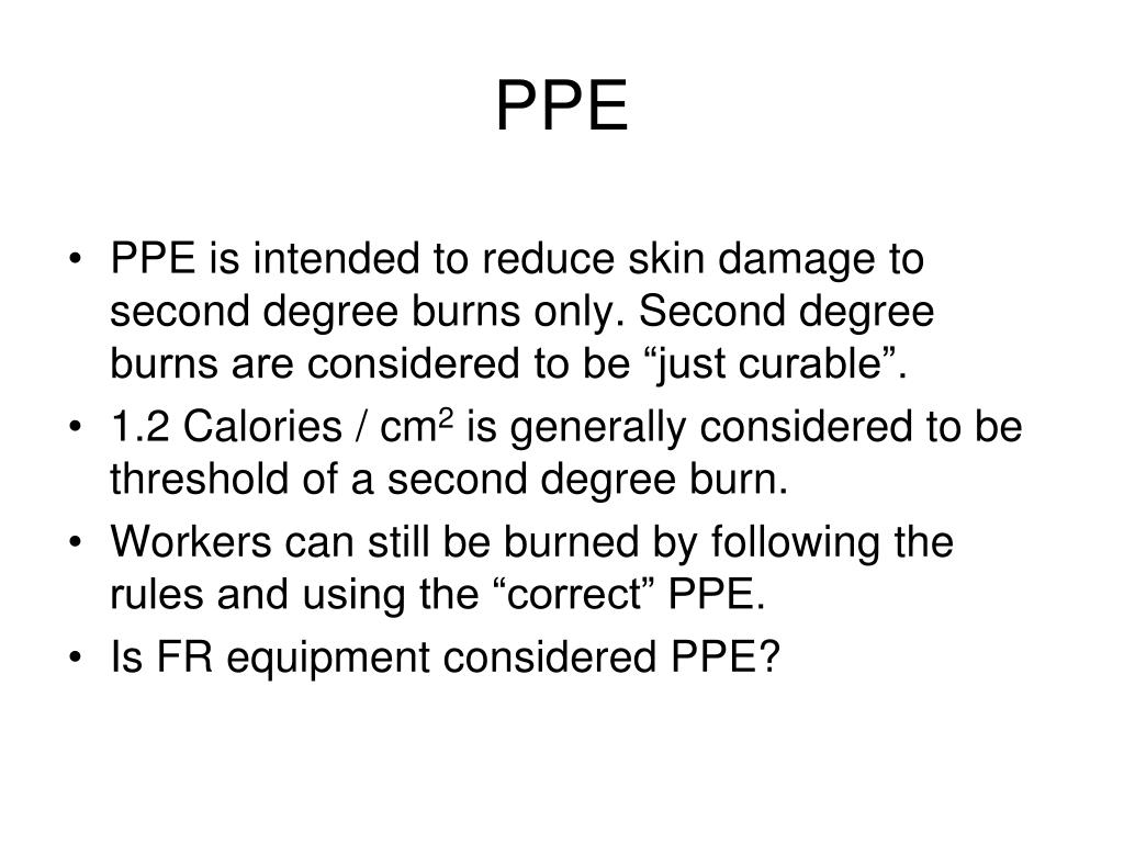 PPE PPE is intended to reduce skin damage to second degree burns only. Second degree burns are considered to be “just curable”. 1.2 Calories / cm2 is generally considered to be threshold of a second degree burn. Workers can still be burned by following the rules and using the “correct” PPE. Is FR equipment considered PPE?