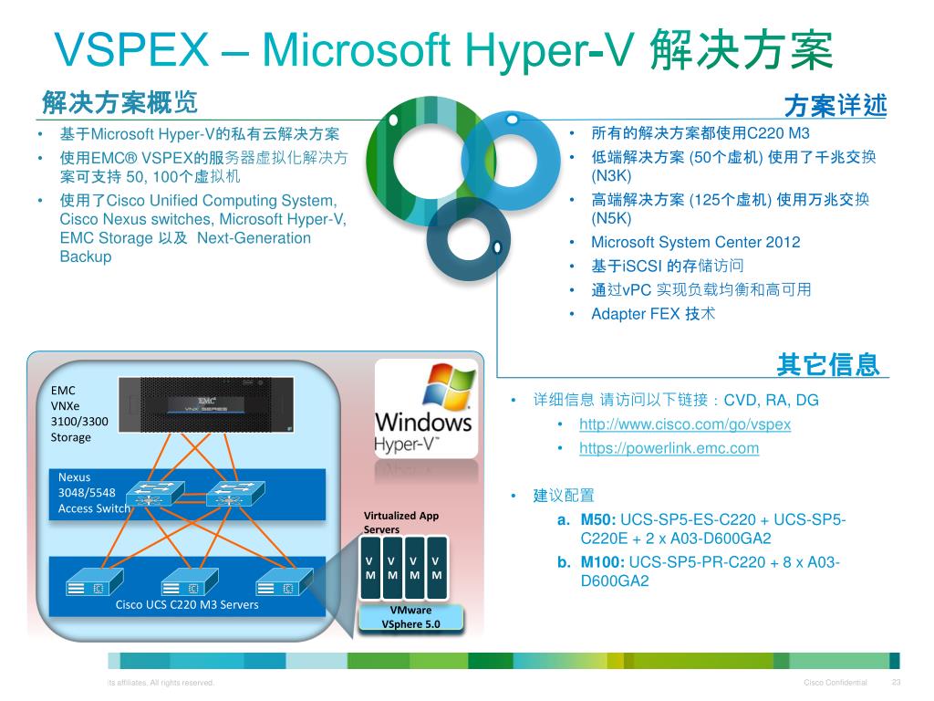 VSPEX – Microsoft Hyper-V 解决方案 解决方案概览 方案详述 • 所有的解决方案都使用C220M3 • 低端解决方案 (50个虚机) 使用了千兆交换 (N3K) • 高端解决方案 (125个虚机) 使用万兆交换 (N5K) • Microsoft System Center 2012 • 基于iSCSI的存储访问 • 通过vPC实现负载均衡和高可用 • Adapter FEX技术 • 基于Microsoft Hyper-V的私有云解决方案 • 使用EMC® VSPEX的服务器虚拟化解决方案可支持 50, 100个虚拟机 • 使用了Cisco Unified Computing System, Cisco Nexus switches, Microsoft Hyper-V, EMC Storage 以及Next-Generation Backup EMC VNXe 3100/3300 Storage Nexus 3048/5548 Access Switch 其它信息 Virtualized App Servers • 详细信息请访问以下链接:CVD, RA, DG • http://www.cisco.com/go/vspex • https://powerlink.emc.com • 建议配置 • M50: UCS-SP5-ES-C220 + UCS-SP5-C220E + 2 x A03-D600GA2 • M100: UCS-SP5-PR-C220 + 8 x A03-D600GA2 VM VM VM VM Cisco UCS C220 M3 Servers VMware VSphere 5.0