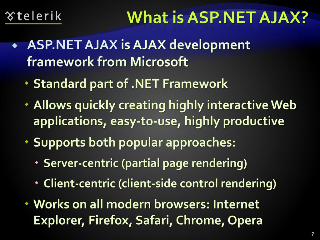 What is ASP.NET AJAX? • ASP.NET AJAX is AJAX development framework from Microsoft • Standard part of .NET Framework • Allows quickly creating highly interactive Web applications, easy-to-use, highly productive • Supports both popular approaches: • Server-centric (partial page rendering) • Client-centric (client-side control rendering) • Works on all modern browsers: Internet Explorer, Firefox, Safari, Chrome, Opera 7