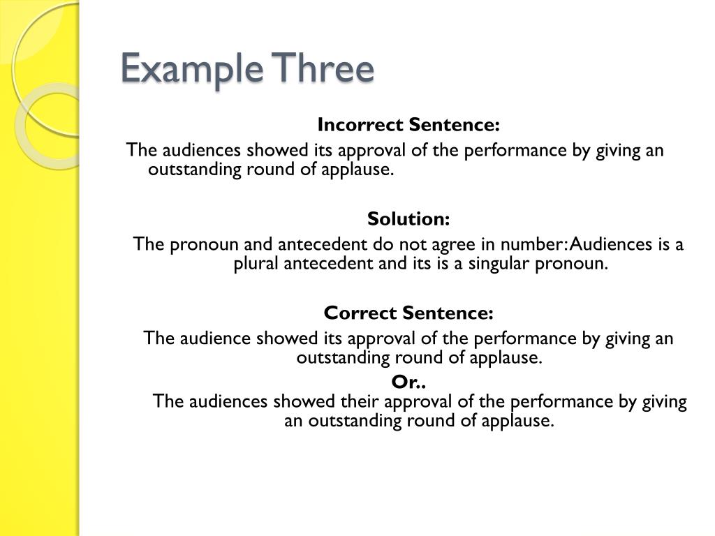 Example Three Incorrect Sentence: The audiences showed its approval of the performance by giving an outstanding round of applause. Solution: The pronoun and antecedent do not agree in number: Audiences is a plural antecedent and its is a singular pronoun. Correct Sentence: The audience showed its approval of the performance by giving an outstanding round of applause. Or..The audiences showed their approval of the performance by giving an outstanding round of applause.