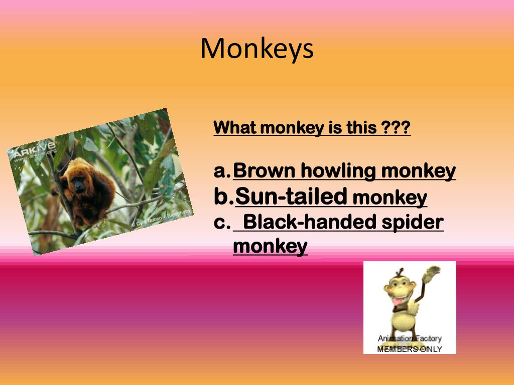Monkeys What monkey is this ??? Brown howling monkey Sun-tailed monkey Black-handed spider monkey