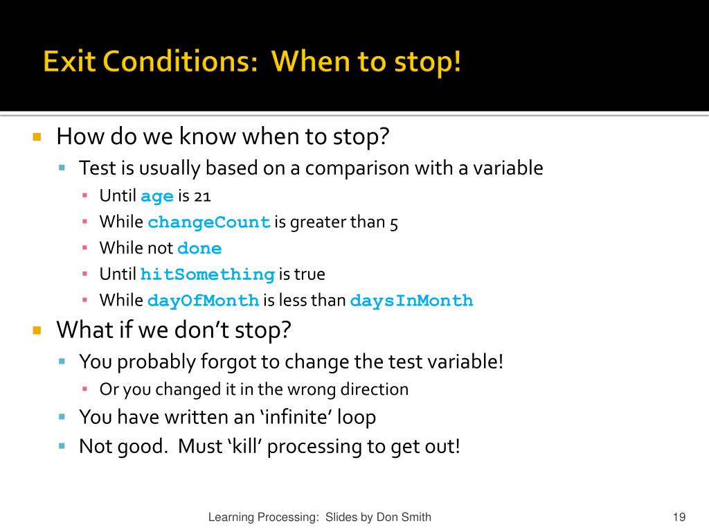 Exit Conditions: When to stop! • How do we know when to stop? • Test is usually based on a comparison with a variable • Until age is 21 • While changeCount is greater than 5 • While not done • Until hitSomething is true • While dayOfMonthis less than daysInMonth • What if we don’t stop? • You probably forgot to change the test variable! • Or you changed it in the wrong direction • You have written an ‘infinite’ loop • Not good. Must ‘kill’ processing to get out! Learning Processing: Slides by Don Smith