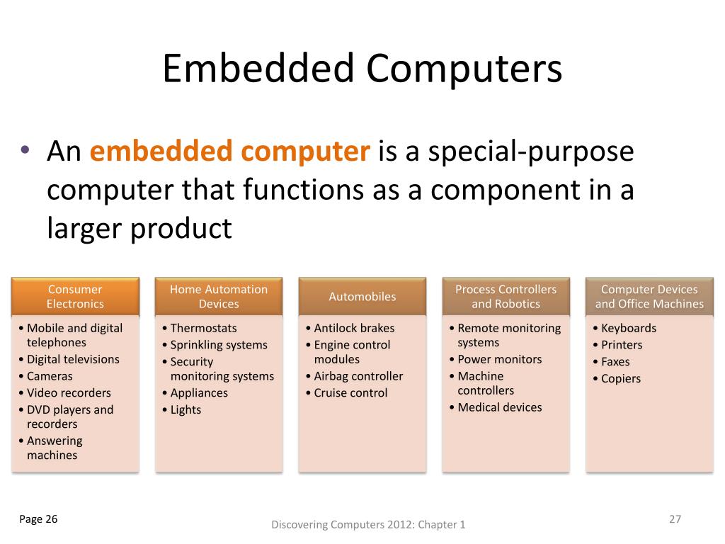 Embedded Computers • An embedded computeris a special-purpose computer that functions as a component in a larger product Discovering Computers 2012: Chapter 1 Page 26