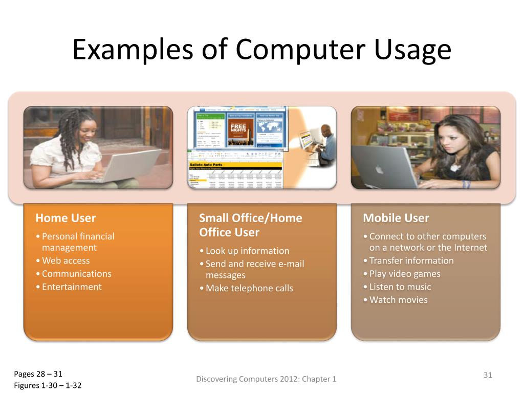 Examples of Computer Usage Discovering Computers 2012: Chapter 1 Pages 28 – 31 Figures 1-30 – 1-32
