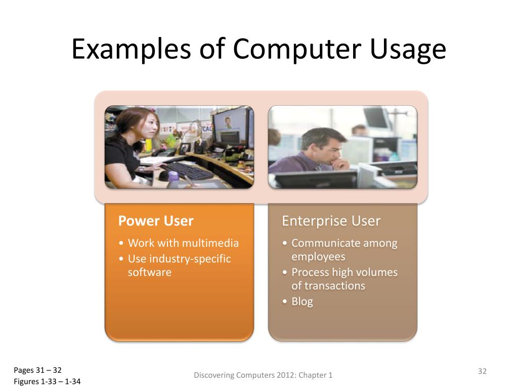 Examples of Computer Usage Discovering Computers 2012: Chapter 1 Pages 31 – 32 Figures 1-33 – 1-34