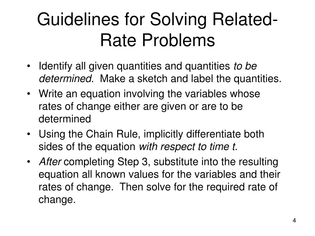 Guidelines for Solving Related-Rate Problems • Identify all given quantities and quantities to be determined. Make a sketch and label the quantities. • Write an equation involving the variables whose rates of change either are given or are to be determined • Using the Chain Rule, implicitly differentiate both sidesof the equation with respect to time t. • After completing Step 3, substitute into the resulting equation all known values for the variables and their rates of change. Then solve for the required rate of change.