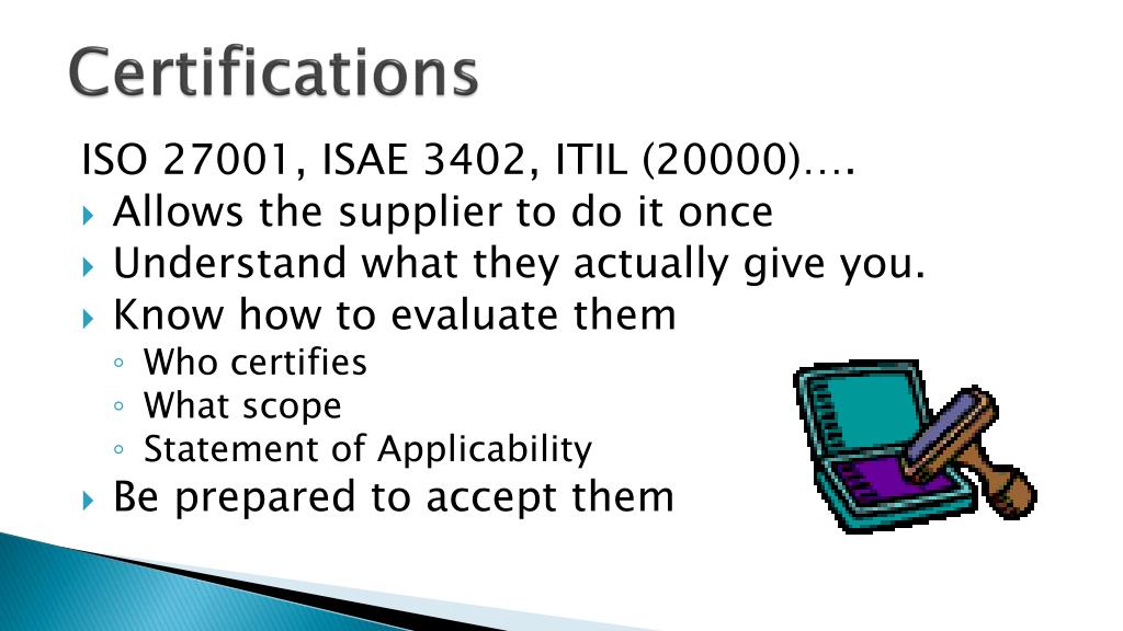 Certifications ISO 27001, ISAE 3402, ITIL (20000)…. • Allows the supplier to do it once • Understand what they actually give you. • Know how to evaluate them • Who certifies • What scope • Statement of Applicability • Be prepared to accept them