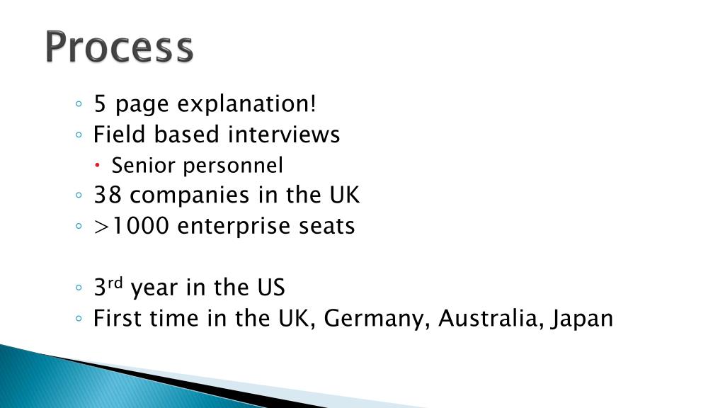 Process • 5 page explanation! • Field based interviews • Senior personnel • 38 companies in the UK • >1000 enterprise seats • 3rd year in the US • First time in the UK, Germany, Australia, Japan