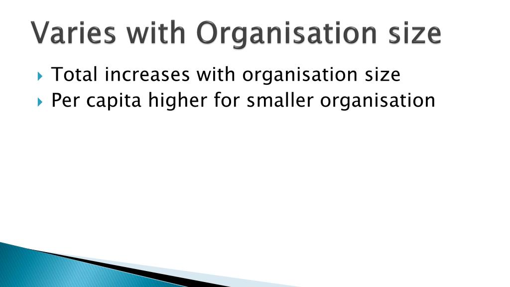 Varies with Organisation size • Total increases with organisation size • Per capita higher for smaller organisation