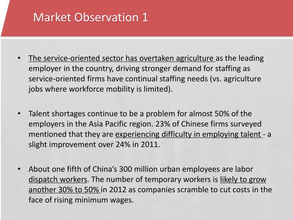Market Observation 1 • The service-oriented sector has overtaken agriculture as the leading employer in the country, driving stronger demand for staffing as service-oriented firms have continual staffing needs (vs. agriculture jobs where workforce mobility is limited). • Talent shortages continue to be a problem for almost 50% of the employers in the Asia Pacific region. 23% of Chinese firms surveyed mentioned that they are experiencing difficulty in employing talent - a slight improvement over 24% in 2011. • About one fifth of China’s 300 million urban employees are labor dispatch workers. The number of temporary workers is likely to grow another 30% to 50% in 2012 as companies scramble to cut costs in the face of rising minimum wages.