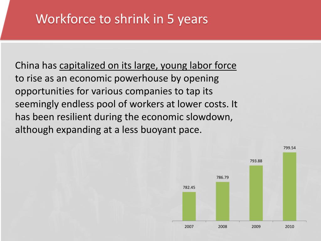 Workforce to shrink in 5 years China has capitalized on its large, young labor force to rise as an economic powerhouse by opening opportunities for various companies to tap its seemingly endless pool of workers at lower costs. It has been resilient during the economic slowdown, although expanding at a less buoyant pace.
