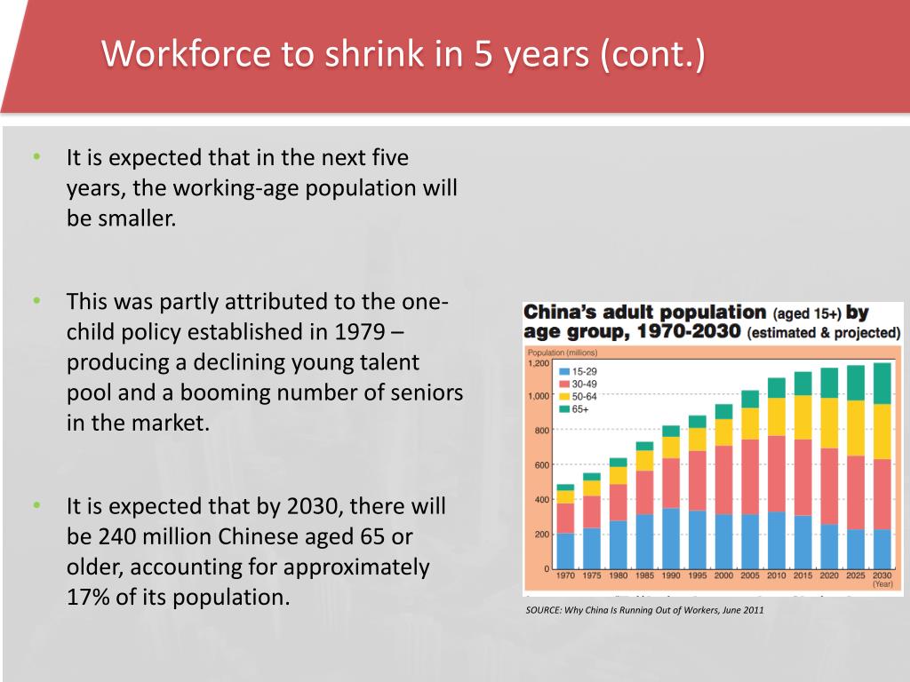 Workforce to shrink in 5 years (cont.) • It is expected that in the next five years, the working-age population will be smaller. • This was partly attributed to the one-child policy established in 1979 – producing a declining young talent pool and a booming number of seniors in the market. • It is expected that by 2030, there will be 240 million Chinese aged 65 or older, accounting for approximately 17% of its population. SOURCE: Why China Is Running Out of Workers, June 2011