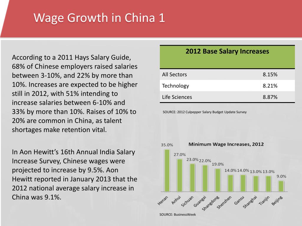 Wage Growth in China 1 • According to a 2011 Hays Salary Guide, 68% of Chinese employers raised salaries between 3-10%, and 22% by more than 10%. Increases are expected to be higher still in 2012, with 51% intending to increase salaries between 6-10% and 33% by more than 10%. Raises of 10% to 20% are common in China, as talent shortages make retention vital. • In Aon Hewitt’s 16th Annual India Salary Increase Survey, Chinese wages were projected to increase by 9.5%. Aon Hewitt reported in January 2013 that the 2012 national average salary increase in China was 9.1%. SOURCE: 2012 Culpepper Salary Budget Update Survey SOURCE: BusinessWeek