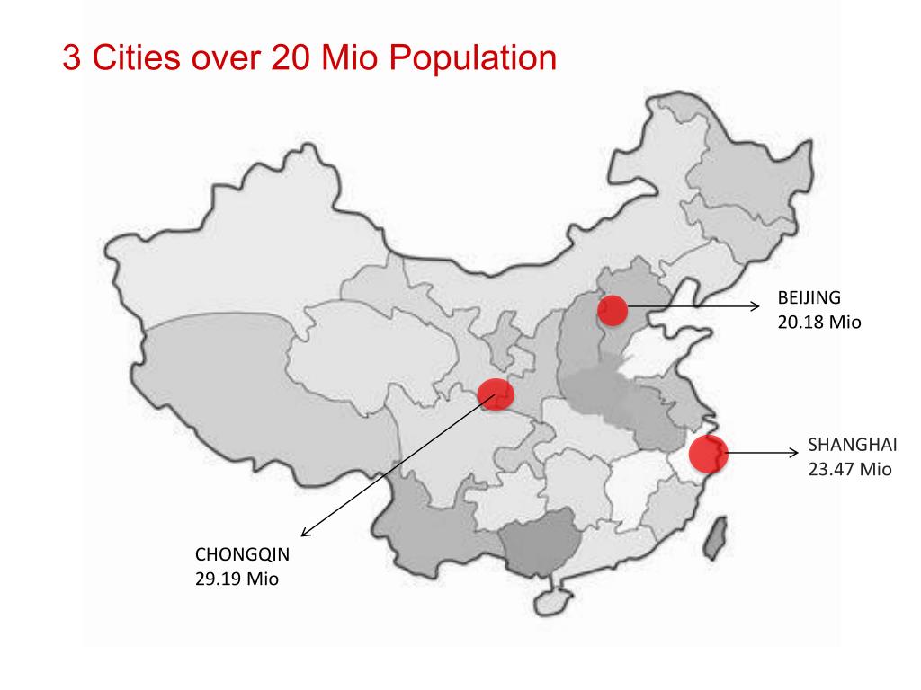 3 Cities over 20 Mio Population BEIJING 20.18 Mio SHANGHAI 23.47 Mio CHONGQIN 29.19 Mio