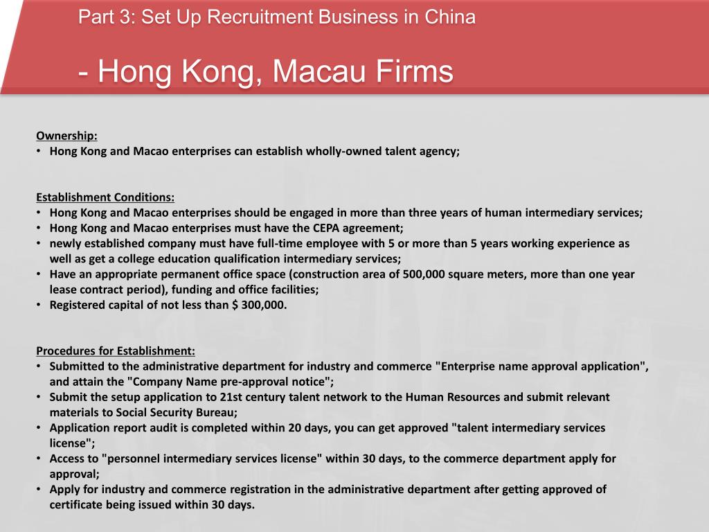 Part 3: Set Up Recruitment Business in China - Hong Kong, Macau Firms • Ownership: • Hong Kong and Macao enterprises can establish wholly-owned talent agency; • Establishment Conditions: • Hong Kong and Macao enterprises should be engaged in more than three years of human intermediary services; • Hong Kong and Macao enterprises must have the CEPA agreement; • newly established company must have full-time employee with 5 or more than 5 years working experience as well as get a college education qualification intermediary services; • Have an appropriate permanent office space (construction area of 500,000 square meters, more than one year lease contract period), funding and office facilities; • Registered capital of not less than $ 300,000. • Procedures for Establishment: • Submitted to the administrative department for industry and commerce "Enterprise name approval application", and attain the "Company Name pre-approval notice"; • Submit the setup application to 21st century talent network to the Human Resources and submit relevant materials to Social Security Bureau; • Application report audit is completed within 20 days, you can get approved "talent intermediary services license"; • Access to "personnel intermediary services license" within 30 days, to the commerce department apply for approval; • Apply for industry and commerce registration in the administrative department after getting approved of certificate being issued within 30 days.