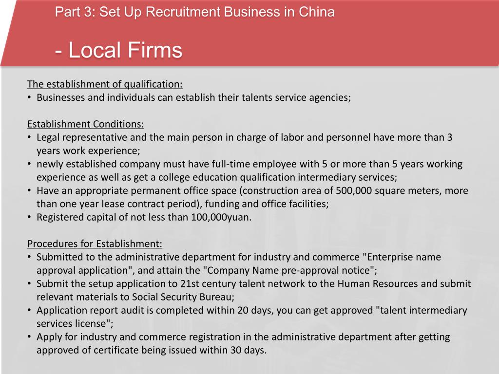 Part 3: Set Up Recruitment Business in China - Foreign Firms • Ownership: • Foreign companies (Excl. Hong Kong and Macao enterprises) shall not establish wholly foreign-owned talent agency; • Foreign companies (Excl. Hong Kong and Macao enterprises) must jointly establish talent agency with Chinese personnel intermediary services enterprises. • Establishment Conditions: • Chinese talent agency should be established above three years; • Foreign investor should be engaged in more than three years of human intermediary services for foreign companies; • The newly established joint venture must have full-time employee with 5 or more than 5 years working experience as well as get a college education qualification intermediary services; • Have an appropriate permanent office space (construction area of 500,000 square meters, with more than one year lease contract period), funding and office facilities; • Registered capital of not less than $ 300,000, of which the proportion of foreign investment shall not be less than 25%, the Chinese investment of not less than 51%. • Procedures for Establishment: • Submitted to the administrative department for industry and commerce "Enterprise name approval application", and attain the "Company Name pre-approval notice"; • Submit the setup application to 21st century talent network to the Human Resources and submit relevant materials to Social Security Bureau; • Application report audit is completed within 20 days, you can get approved "talent intermediary services license"; • Access to "personnel intermediary services license" within 30 days, to the commerce department apply for approval; • Apply for industry and commerce registration in the administrative department after getting approved of certificate being issued within 30 days.