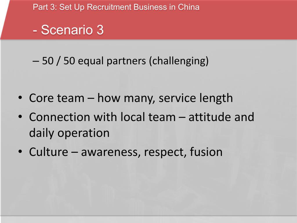Part 3: Set Up Recruitment Business in China - Scenario 3 • 50 / 50 equal partners (challenging) • Core team – how many, service length • Connection with local team – attitude and daily operation • Culture – awareness, respect, fusion