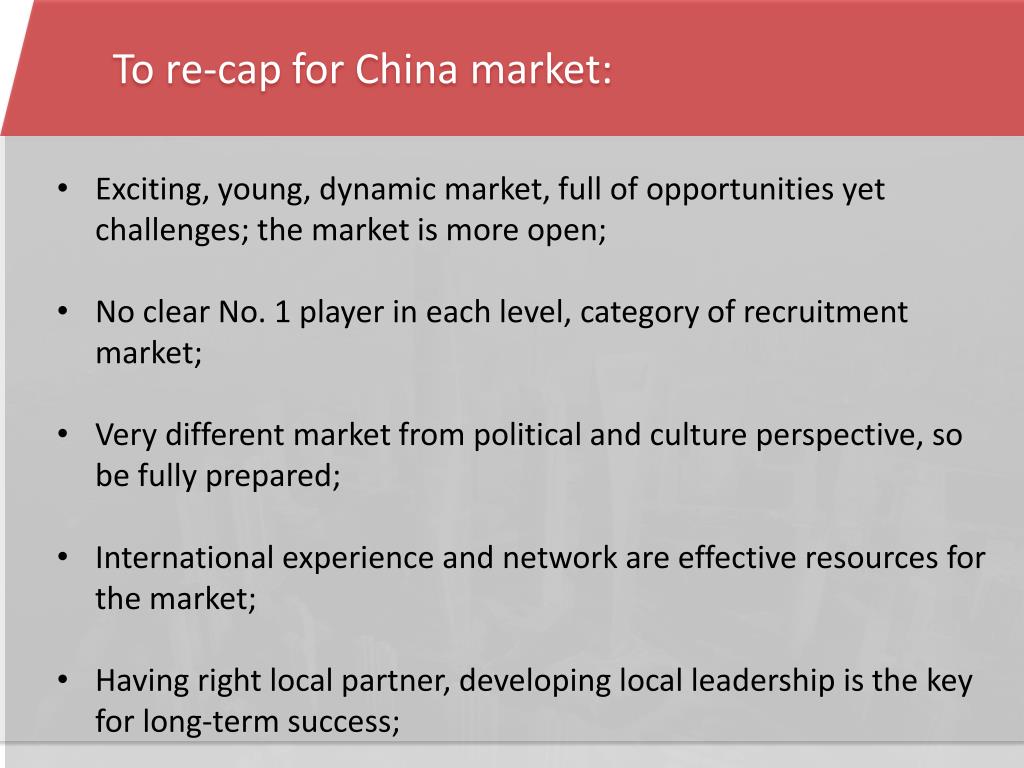To re-cap for China market: • Exciting, young, dynamic market, full of opportunities yet challenges; the market is more open; • No clear No. 1 player in each level, category of recruitment market; • Very different market from political and culture perspective, so be fully prepared; • International experience and network are effective resources for the market; • Having right local partner, developing local leadership is the key for long-term success;