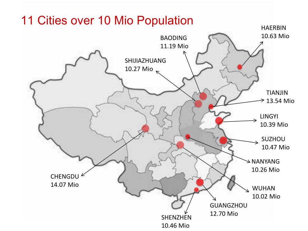 11 Cities over 10 Mio Population HAERBIN 10.63 Mio BAODING 11.19 Mio SHIJIAZHUANG 10.27 Mio TIANJIN 13.54 Mio LINGYI 10.39 Mio SUZHOU 10.47 Mio NANYANG 10.26 Mio CHENGDU 14.07 Mio WUHAN 10.02 Mio GUANGZHOU 12.70 Mio SHENZHEN 10.46 Mio