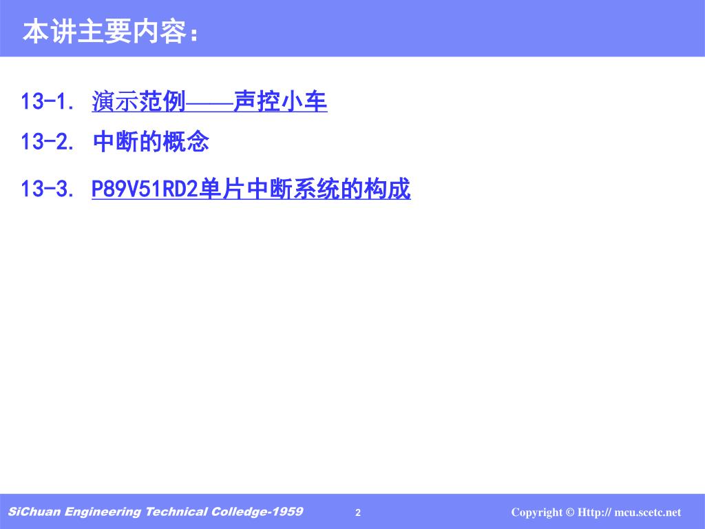 本讲主要内容: 13-1. 演示范例——声控小车 13-2. 中断的概念 13-3. P89V51RD2单片中断系统的构成 SiChuan Engineering Technical Colledge-1959