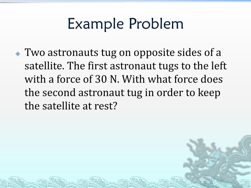 Example Problem • Two astronauts tug on opposite sides of a satellite. The first astronaut tugs to the left with a force of 30 N. With what force does the second astronaut tug in order to keep the satellite at rest?