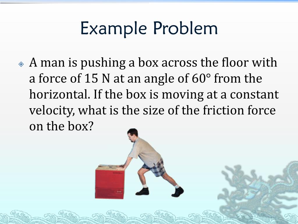 Example Problem • A man is pushing a box across the floor with a force of 15 N at an angle of 60° from the horizontal. If the box is moving at a constant velocity, what is the size of the friction force on the box?