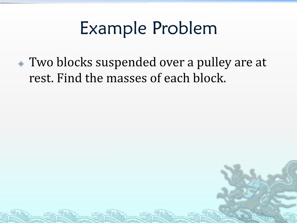 Example Problem • Two blocks suspended over a pulley are at rest. Find the masses of each block.